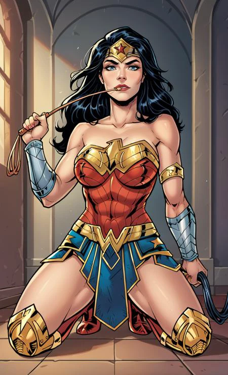 WonderwomanRB,1girl,solo,long hair,blue eyes,skirt,black hair,cleavage,bare shoulders,collarbone,armor,tiara,armlet,bracer,whip,superhero