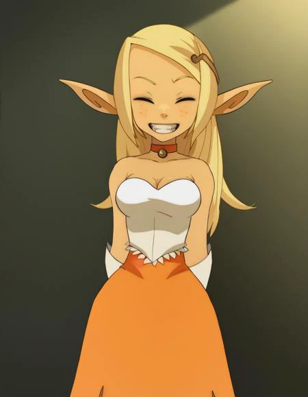 Eva, 1girl, freckles, pointy ears, elf, solo, blonde hair, long hair, green eyes, white gloves, choker, orange dress, hair ornament, platform footwear, bare shoulders, cleavage, hairclip, bow,jewelry
