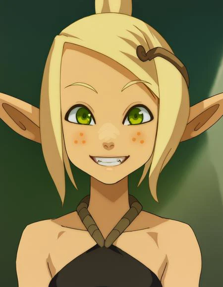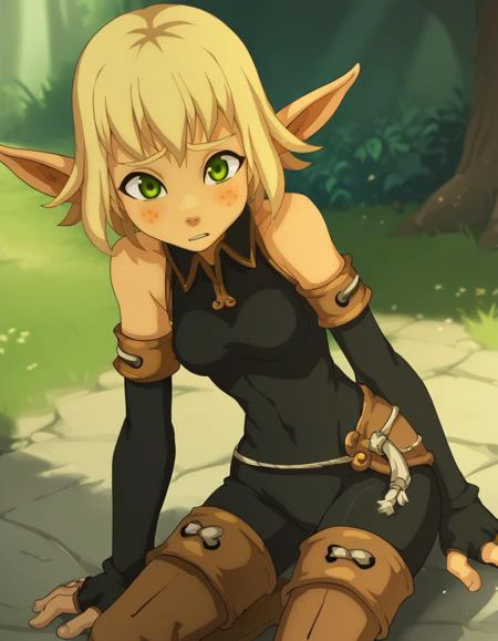 Eva, 1girl, freckles, blonde hair, solo, pointy ears, gloves, green eyes, bare shoulders, halterneck,thigh boots, elf, hair ornament, ponytail, quiver, belt