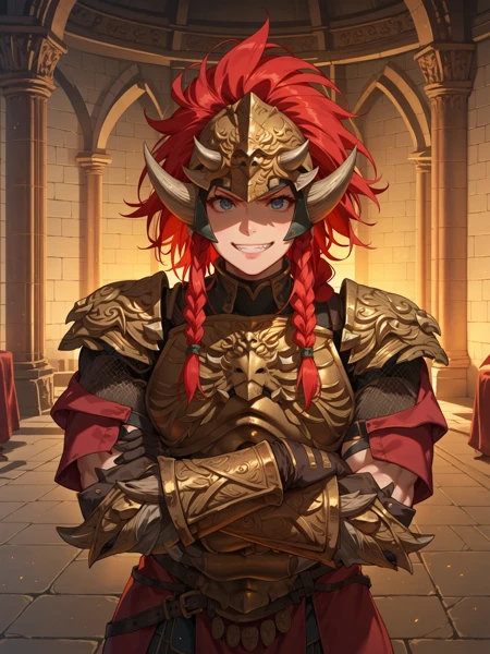 YoungLionArmor, red hair, braid, armor, helmet, breastplate, pauldrons, shoulder armor, fake horns, gauntlets