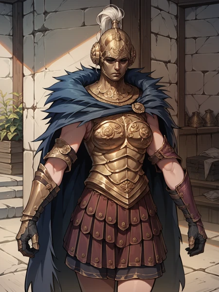 FreyjasArmor, armor, breastplate, helmet, gloves, gauntlets, skirt, masked helmet, expressionless, black eye sockets, no eyes, sandals