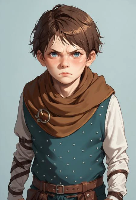 1boy, brown hair, short hair, blue eyes, scarf, long sleeves, belt