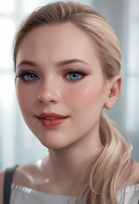 1girl, blonde hair, long hair, ponytail, hair over shoulder, lips, blue eyes, sleeveless, dress, sleeveless dress