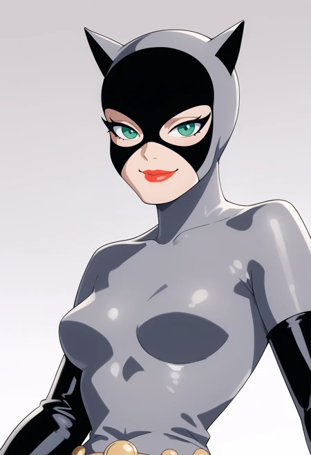 1girl, catwoman, green eyes, mask, lipstick, grey bodysuit, belt, black elbow gloves, boots