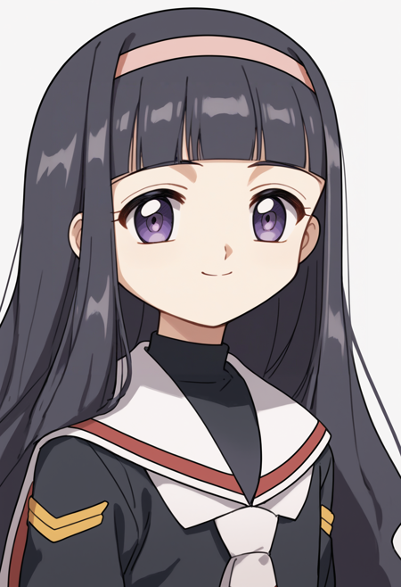 1girl, daidouji tomoyo, black hair, long hair, blunt bangs, hairband, long hair, purple eyes