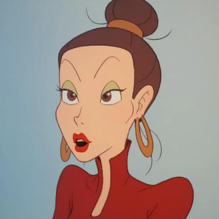 Emma, 1girl, solo, brown hair, hair bun, brown eyes, lipstick, hoop earrings,