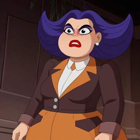 NannyNightmare, 1girl, solo, purple hair, black eyes, red lips, brown jacket, white shirt orange skirt black footwear