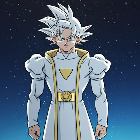 Omni-Goku, 1boy, solo, white hair, spiked hair, grey eyes, Omni-King Outfit,