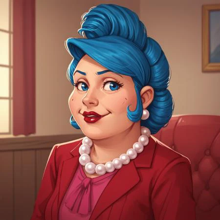 BessieBusybody, 1girl, solo, blue hair, blue eyes, lipstick pearl necklace, red suit, pearl necklace red pencil skirt high heels