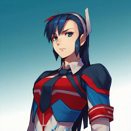 UltraMagnus, 1girl, solo, blue hair, long hair, blue eyes, shirt, necktie, red armband skirt, bracer, Pantyhose
