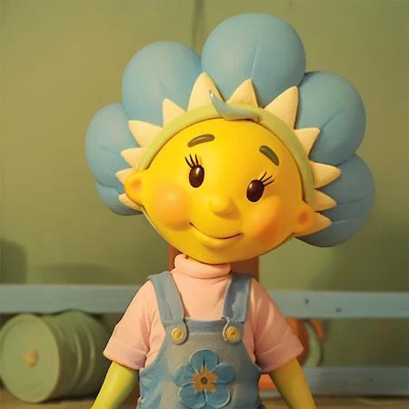 Fifi, 1girl, solo, black eyes, yellow skin, blue overalls, yellow footwear