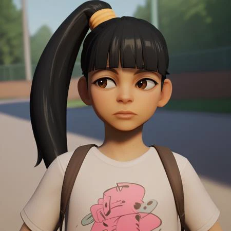AllyHoops, 1girl, solo, black hair, brown eyes, ponytail, blunt bangs, shorts, white socks, white footwear,