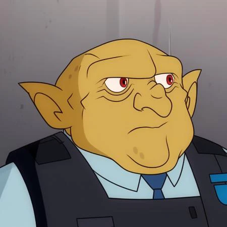1boy, solo, BARNABASDINGLEKNOT, red eyes, pointy ears, green skin, shirt, necktie, vest, vest, uniform, long sleeves, pants, black footwear, belt