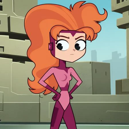 SavannahGlama, 1girl, solo, orange hair, long hair, black eyes, bodysuit,