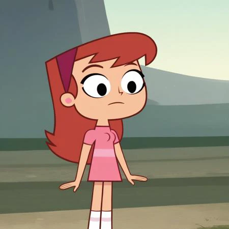 VanaGlama, 1girl, solo, red hair, long hair, black eyes, headband, pink dress, short sleeves, white socks, striped socks pink footwear