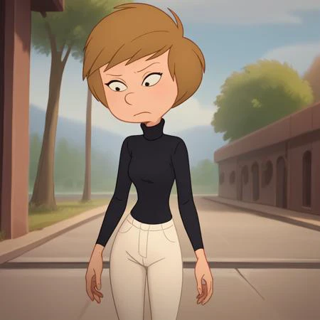 1girl, solo, MOM, brown hair, black eyes, short hair, turtleneck, long sleeves, white pants, brown footwear