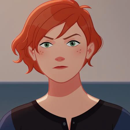 IvyCS, 1girl, solo, red hair, short hair, blue eyes, freckles, raglan black shirt, short sleeves, pants, shoes
