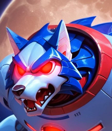1boy, male wolf, wolf ears, metallic body, silver body, blue body, two tone body, tail, claws, flesh fangs, red eyes, glowing eyes, no pupils