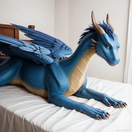 Additional prompts: dragon, blue scales, feathered wings, horns, tail, blue eyes, feral, female, 1girl