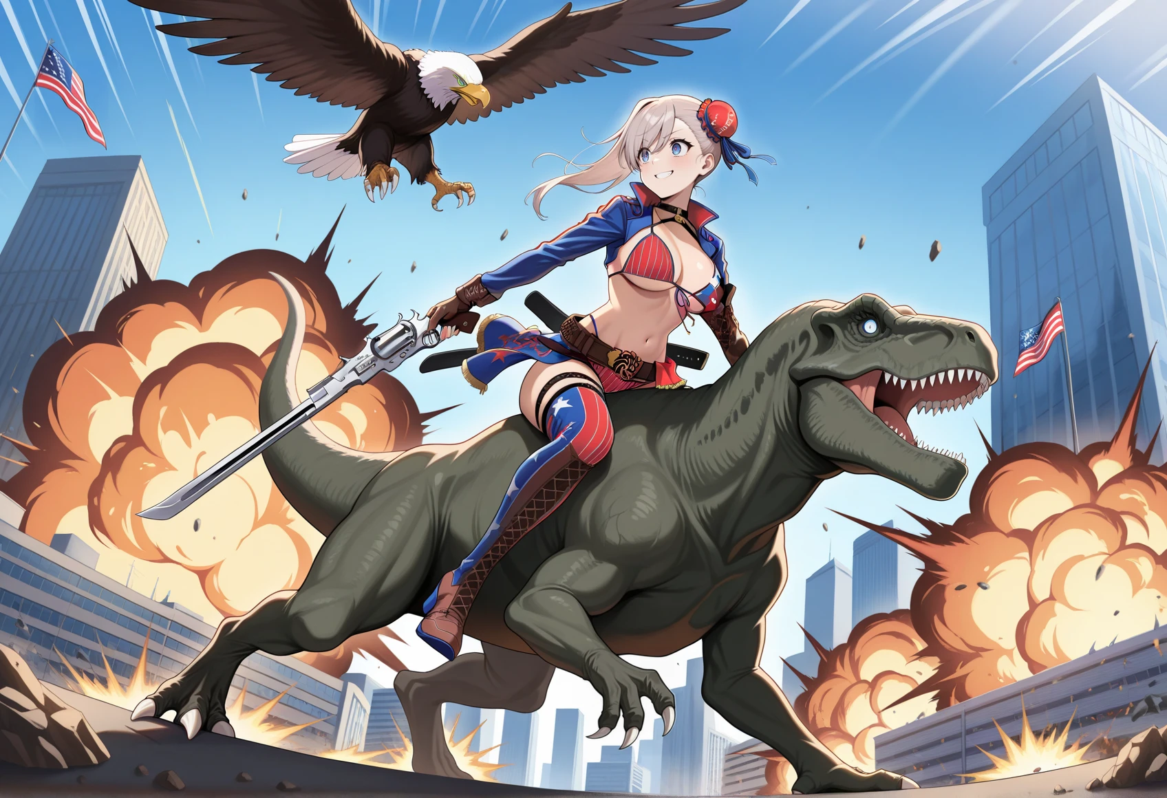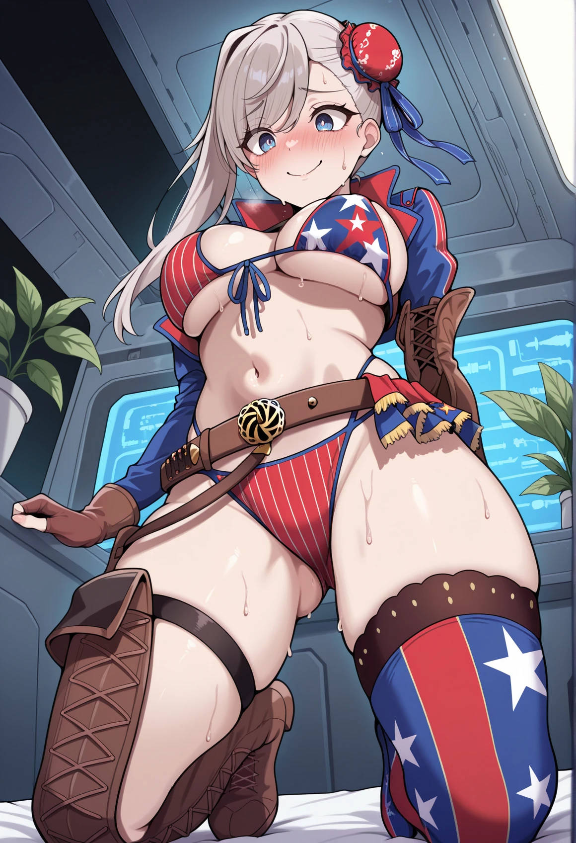 Swimsuit2: blue eyes, long hair, grey hair, single sidelock, single hair bun, bun cover, red bun cover, American Flag Bikini, cropped jacket, long sleeves, asymmetrical gloves, fingerless gloves, asymmetrical legwear, asymmetrical footwear, Single Thighhigh, thigh boots, belt