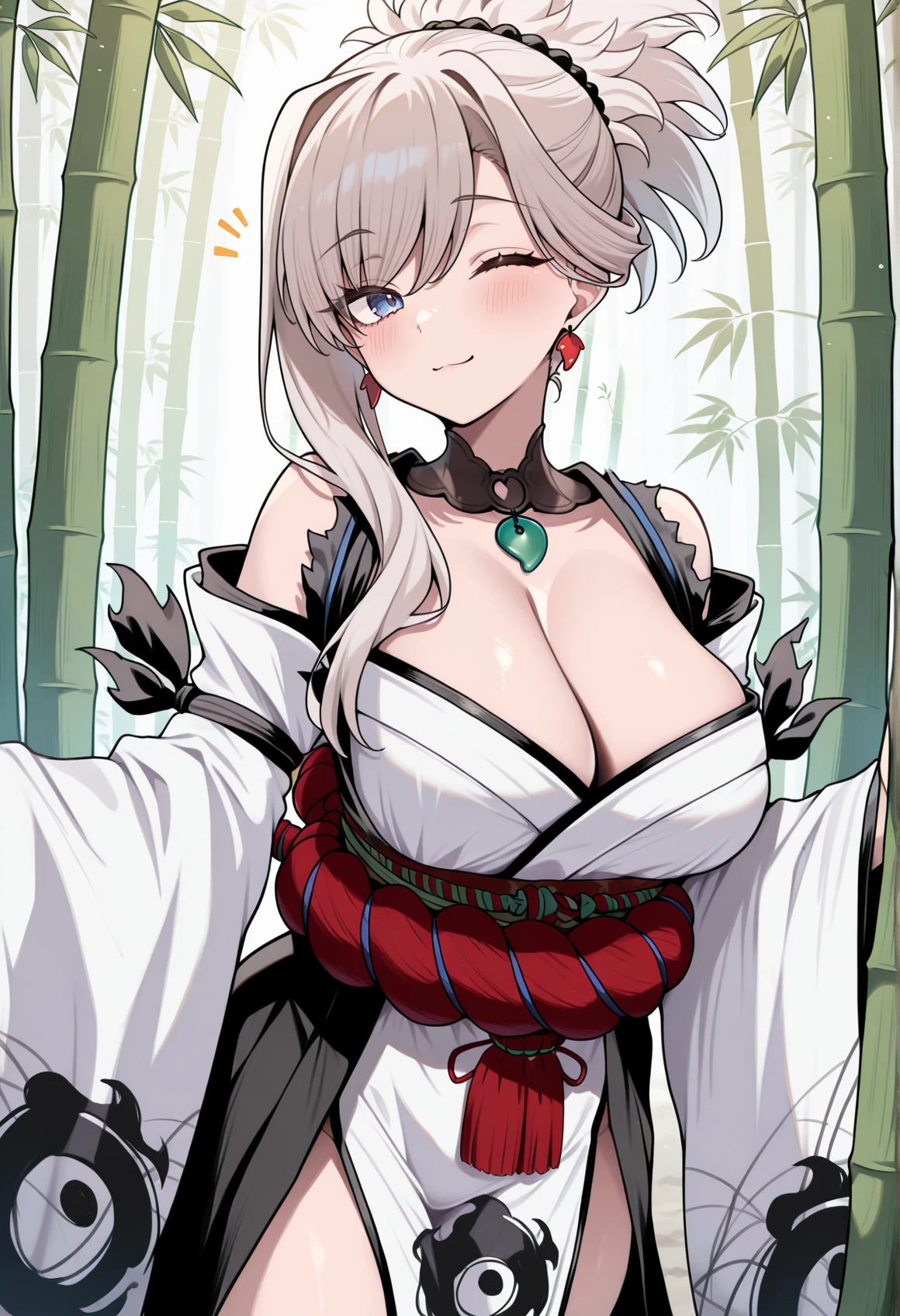 Samurai: blue eyes, long hair, grey hair, single sidelock, ponytail, scrunchie, japanese clothes, detached collar, magatama, White kimono, pelvic curtain, detached sleeves, wide sleeves, rope, earrings, cleavage