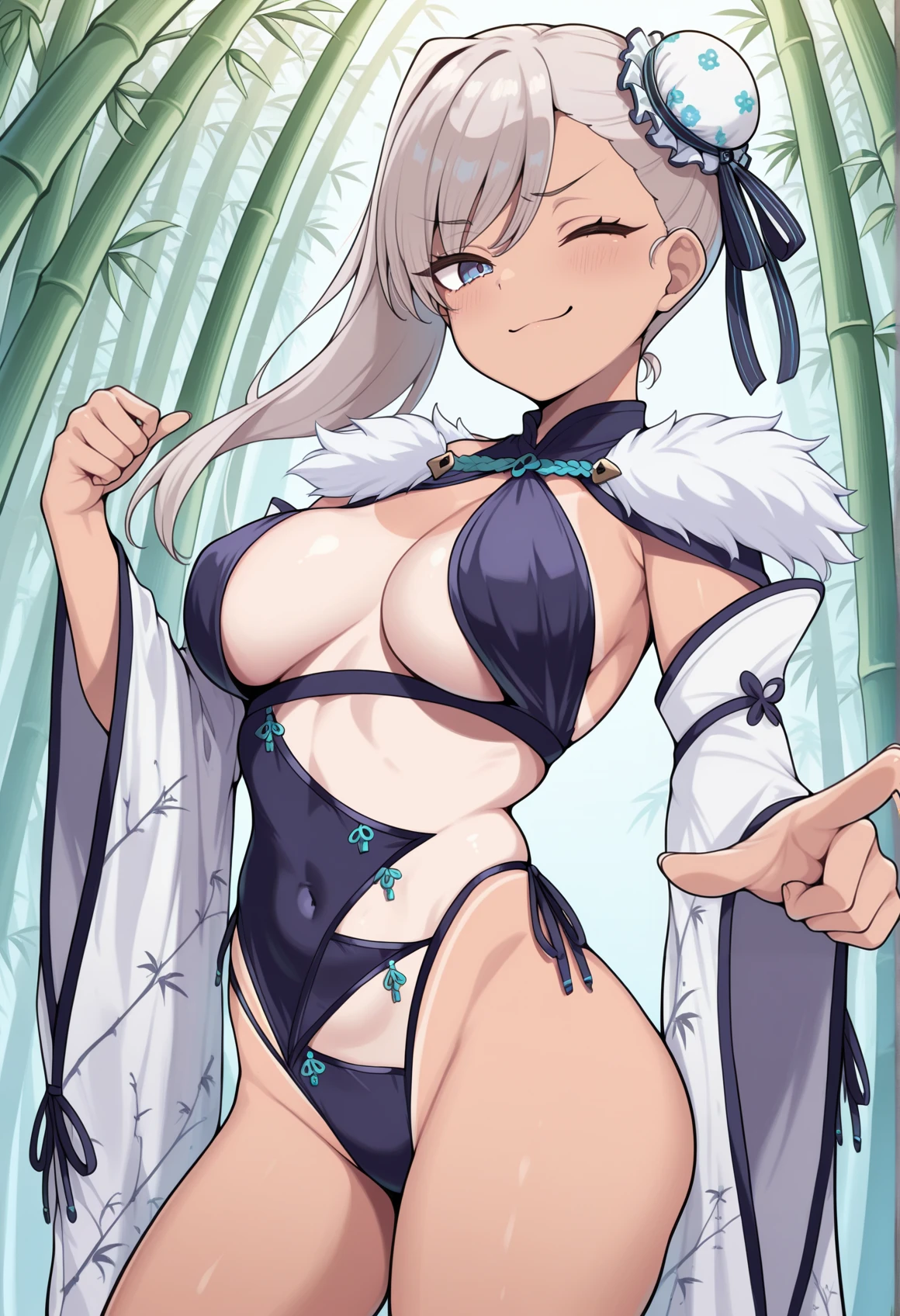 Swimsuit3: blue eyes, long hair, grey hair, single sidelock, single hair bun, bun cover, one-piece swimsuit, clothing cutout, string, fur trim, detached sleeves, wide sleeves