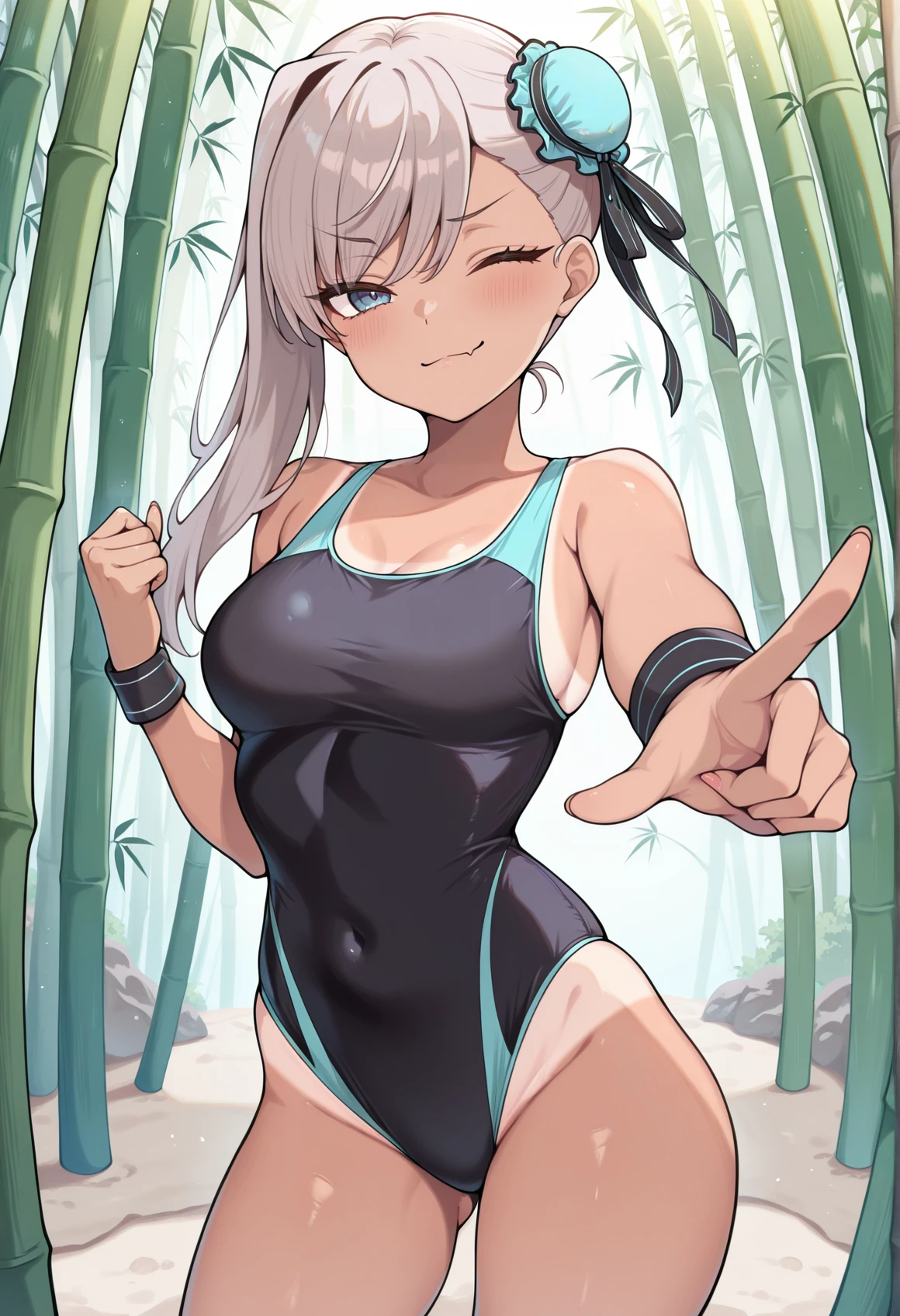 Swimsuit1: blue eyes, long hair, grey hair, single sidelock, single hair bun, bun cover, black one-piece swimsuit, sports swimsuit, wristband