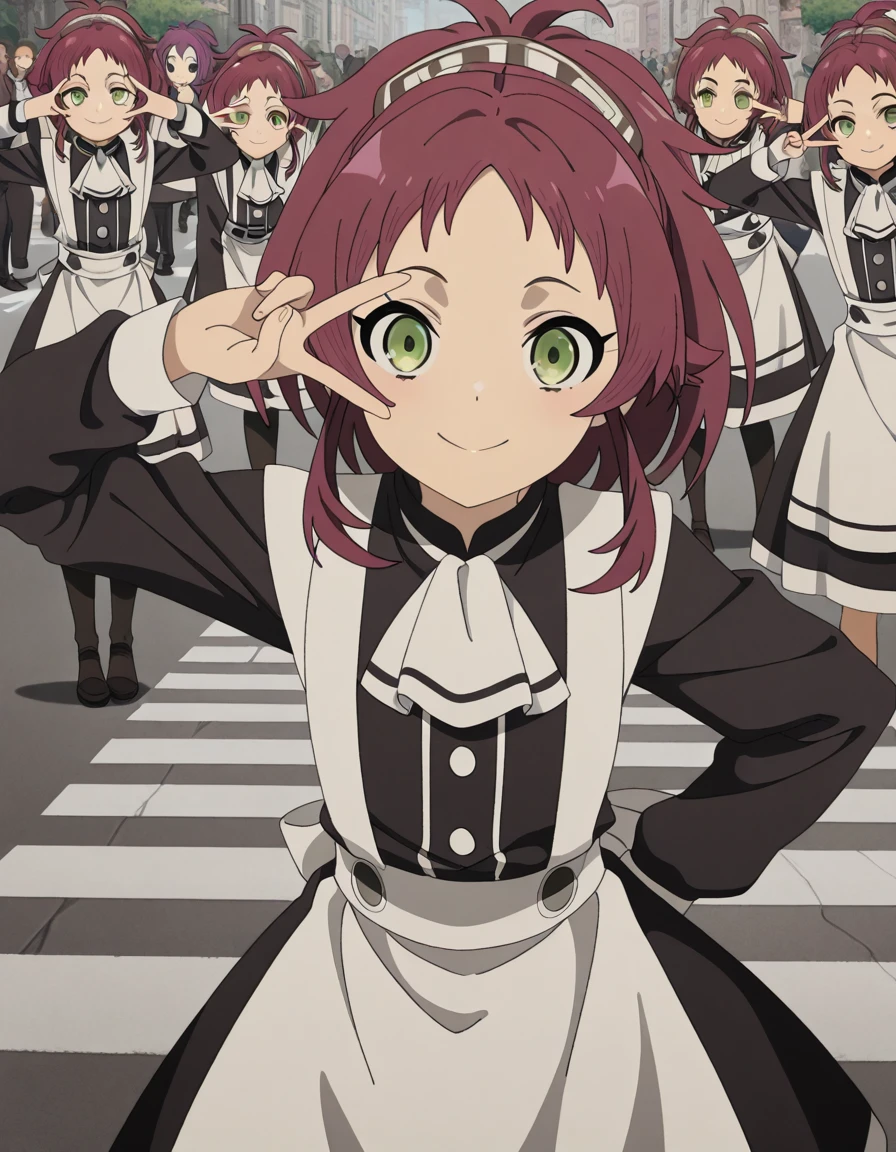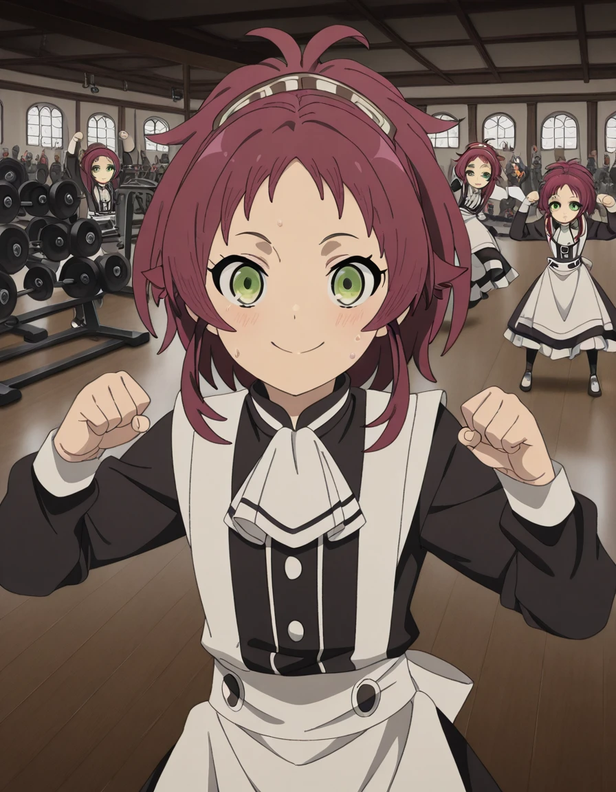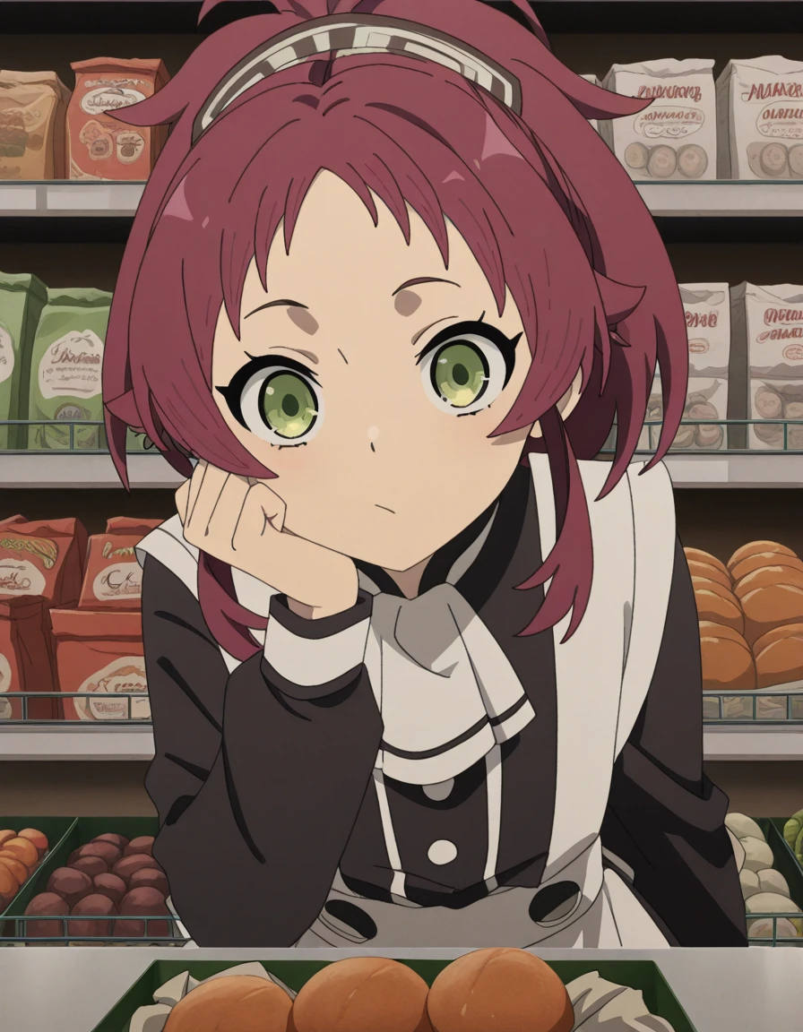 aisha greyrat, green eyes, ponytail, red hair, anime screencap