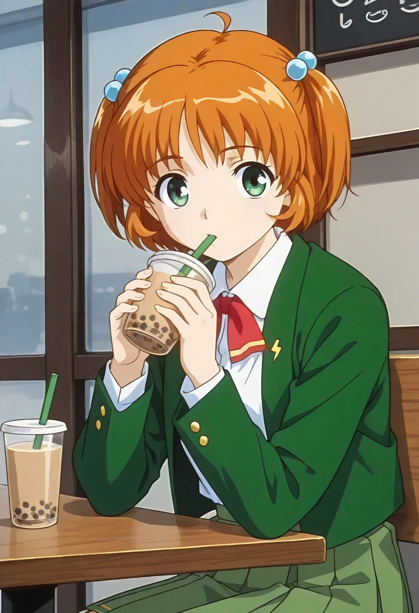 takasu_suzune_uniform, school uniform, red neck ribbon, green short jacket, white collared shirt, green pleated skirt, long sleeves, open jacket