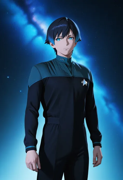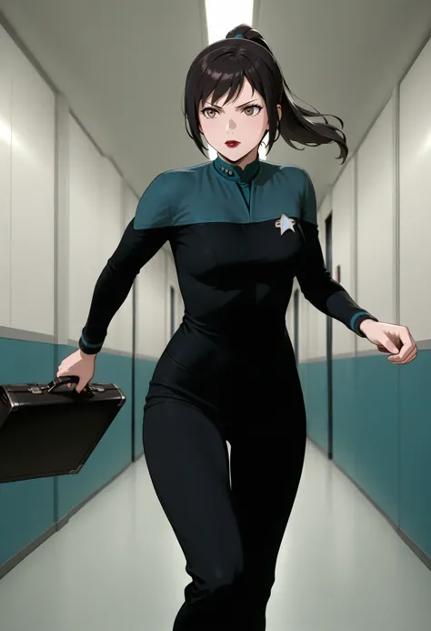 black DS9 uniform,teal neck,long sleeves,grey shoulder,black pants