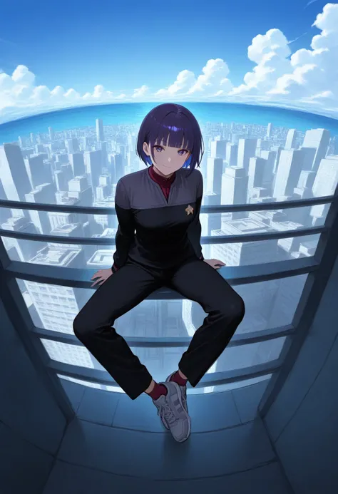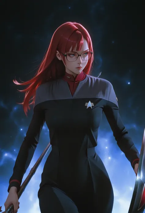 black DS9 uniform,red neck,long sleeves,grey shoulder,black pants