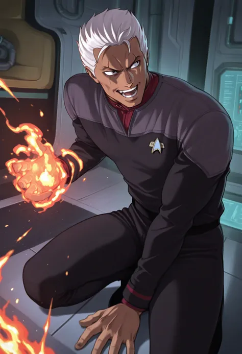 -The best trigger phrase is "black DS9 uniform,<color> neck,long sleeves,grey shoulder,black pants", where <color> is red,teal or yellow