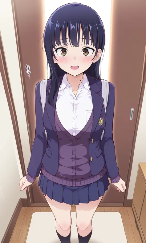 school uniform, blue skirt, long_sleeve, blazer, open blazer, close