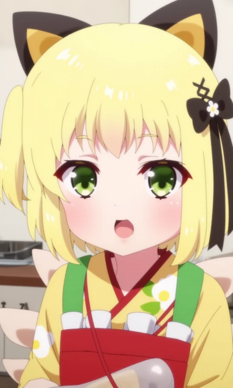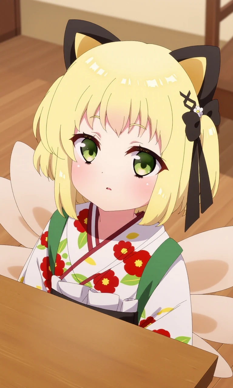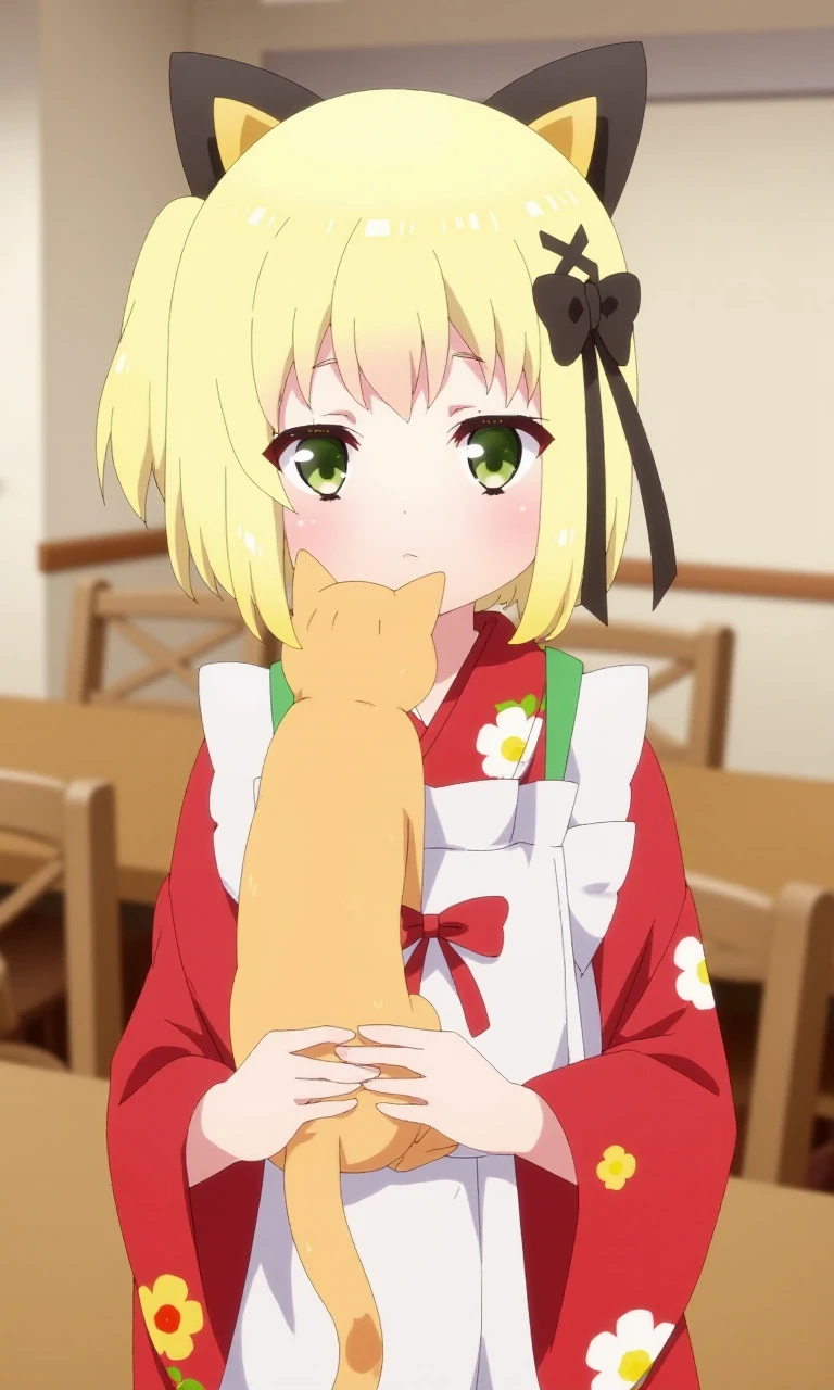 anime art,g3kk4 girl looking at the viewer,she has a black hair bow with a long thin ribbon that extends down forming a crisscross 'X' pattern,the bow is accented with a small white flower in the center,she is also wearing black and yellow cat ears,she has fairy wings