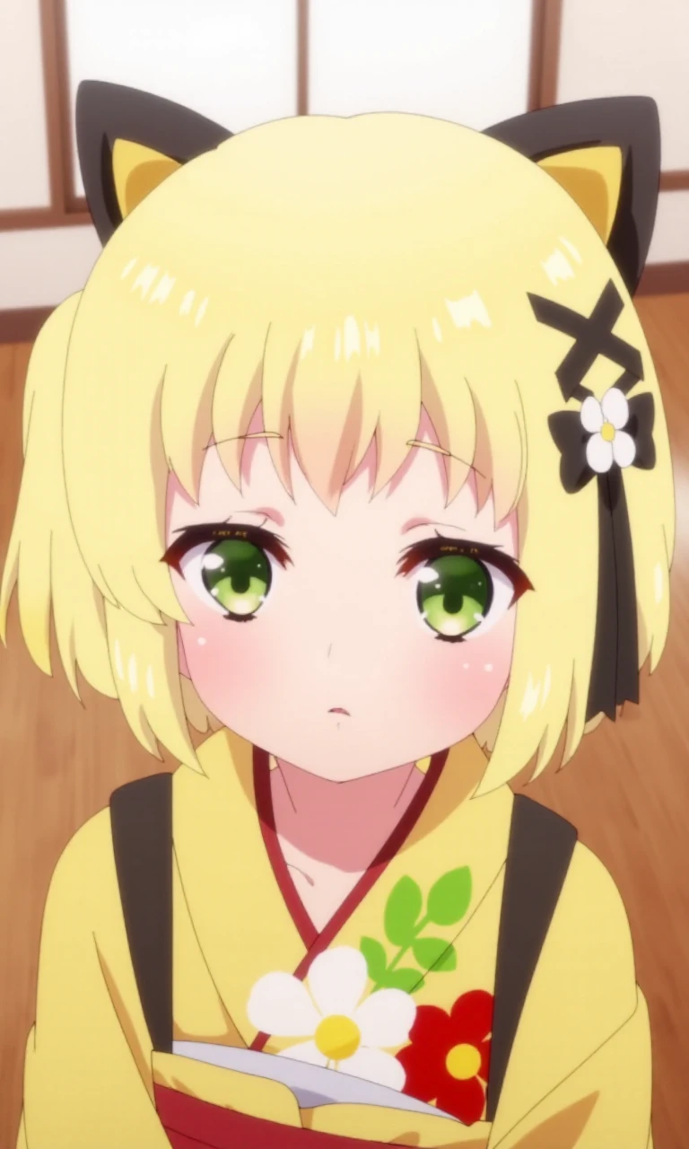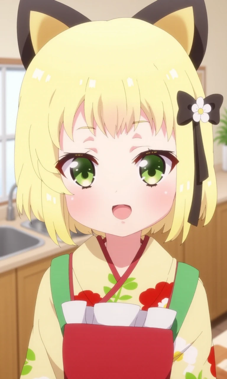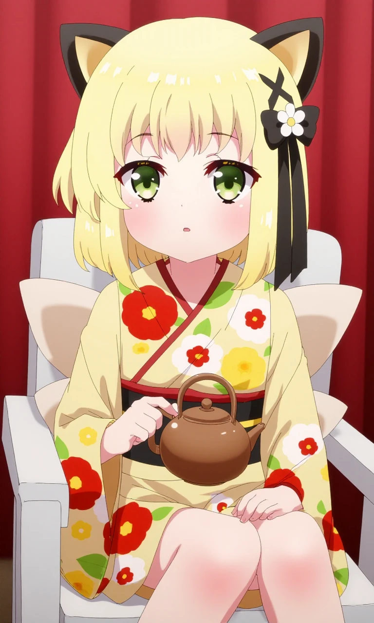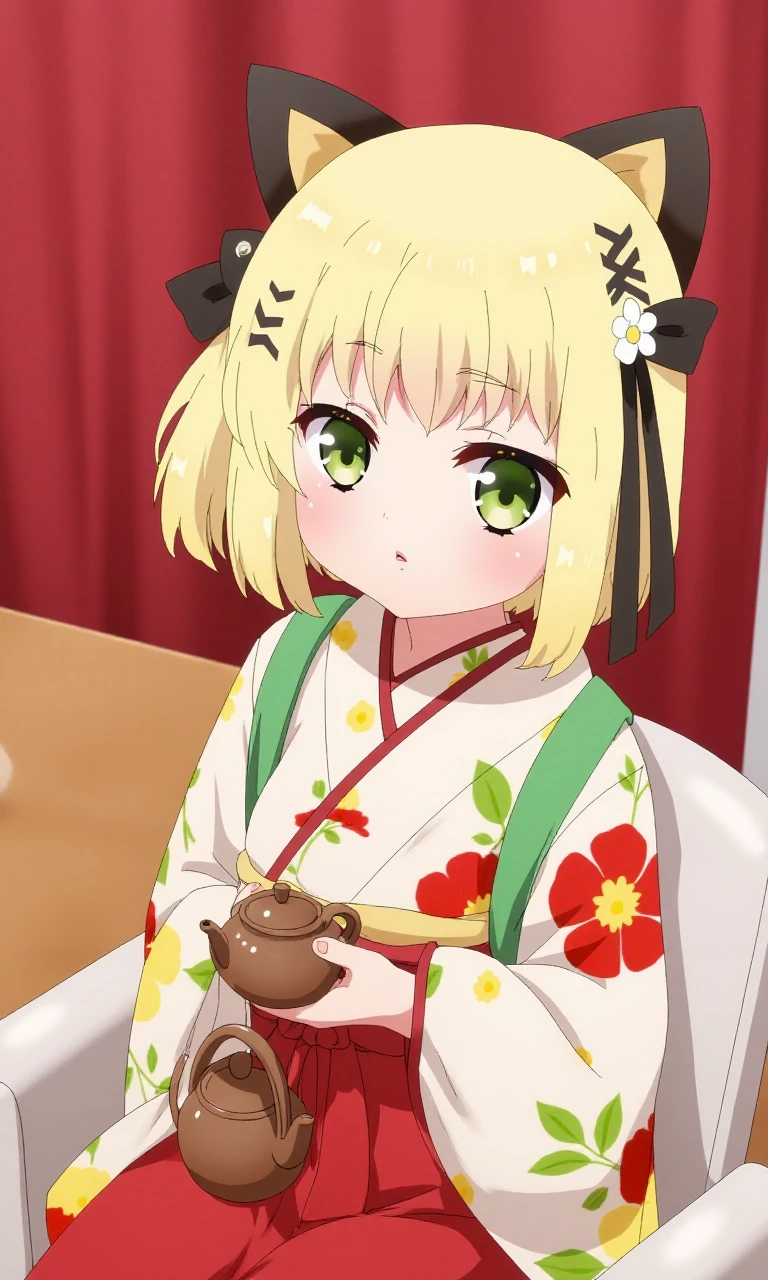 anime art,g3kk4 girl looking at the viewer,she has a black hair bow with a long thin ribbon that extends down forming a crisscross 'X' pattern,the bow is accented with a small white flower in the center,she is also wearing black and yellow cat ears,she has fairy wings