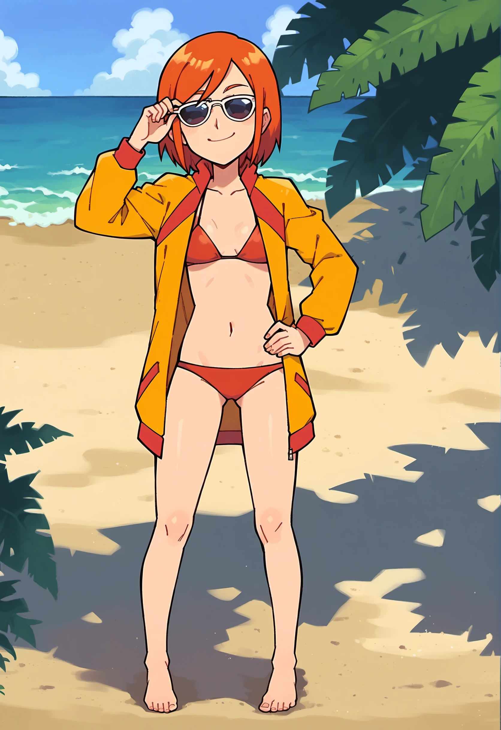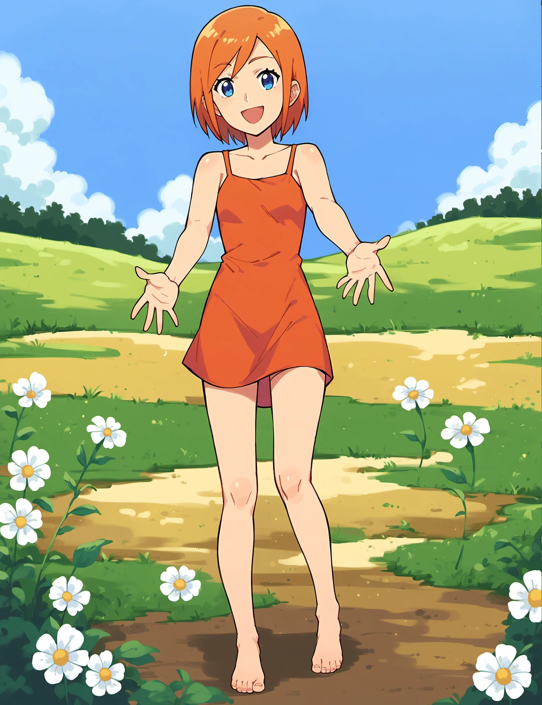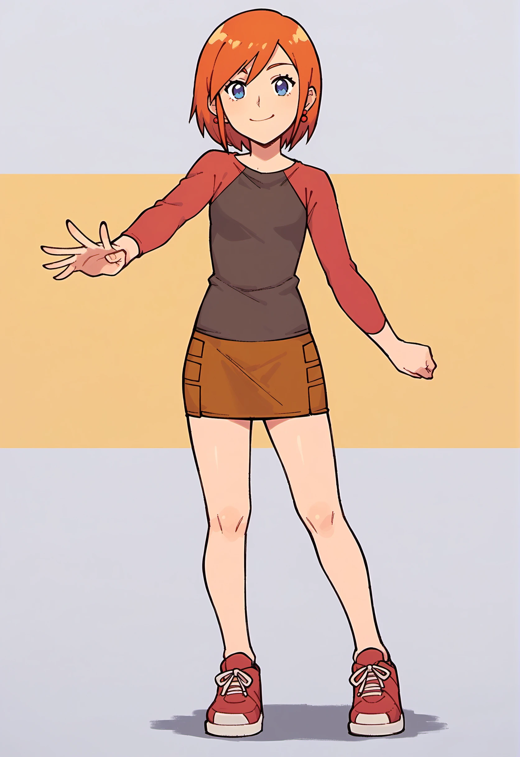 1girl, blue eyes, orange hair, short hair, swept bangs, small breast.Clothing: