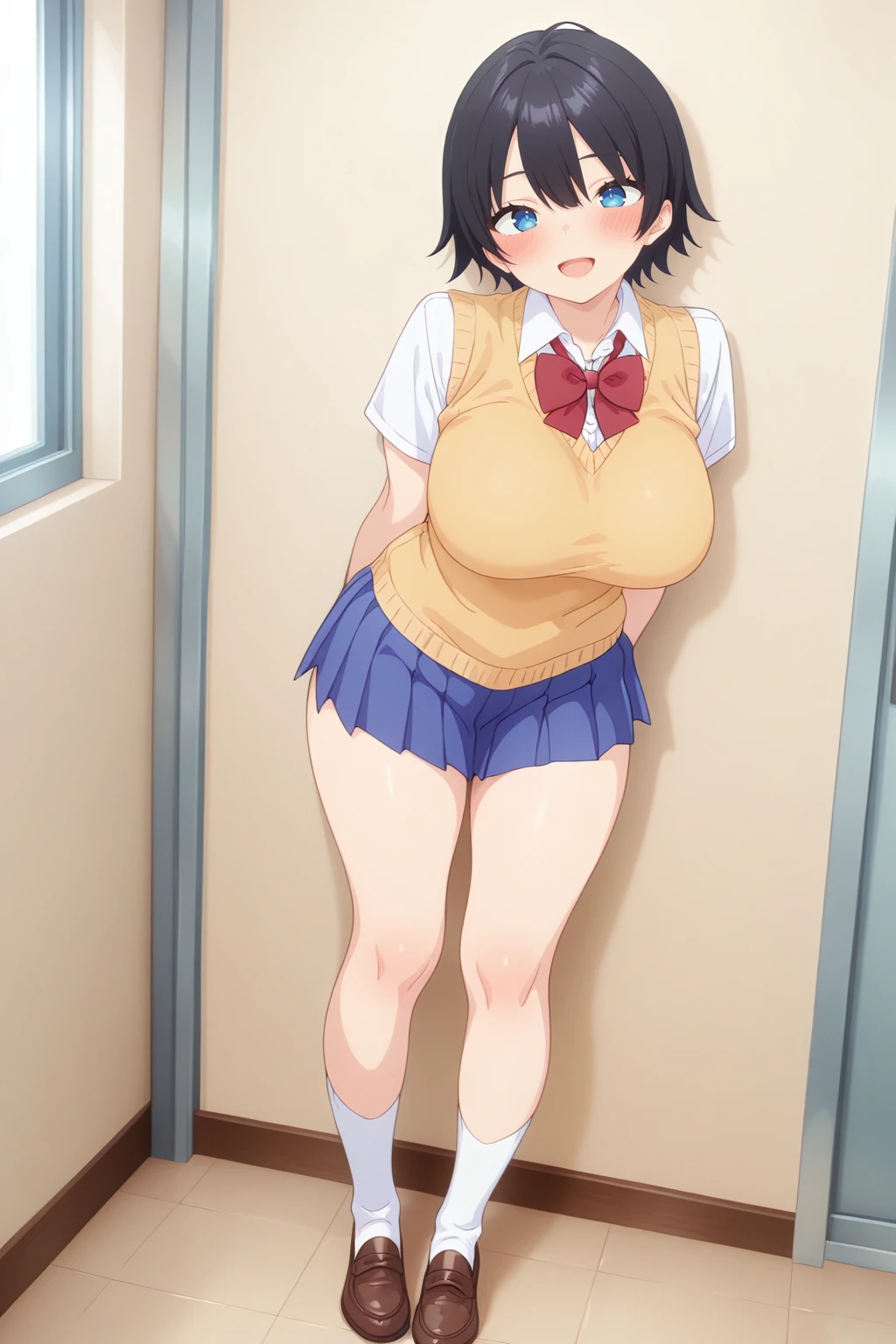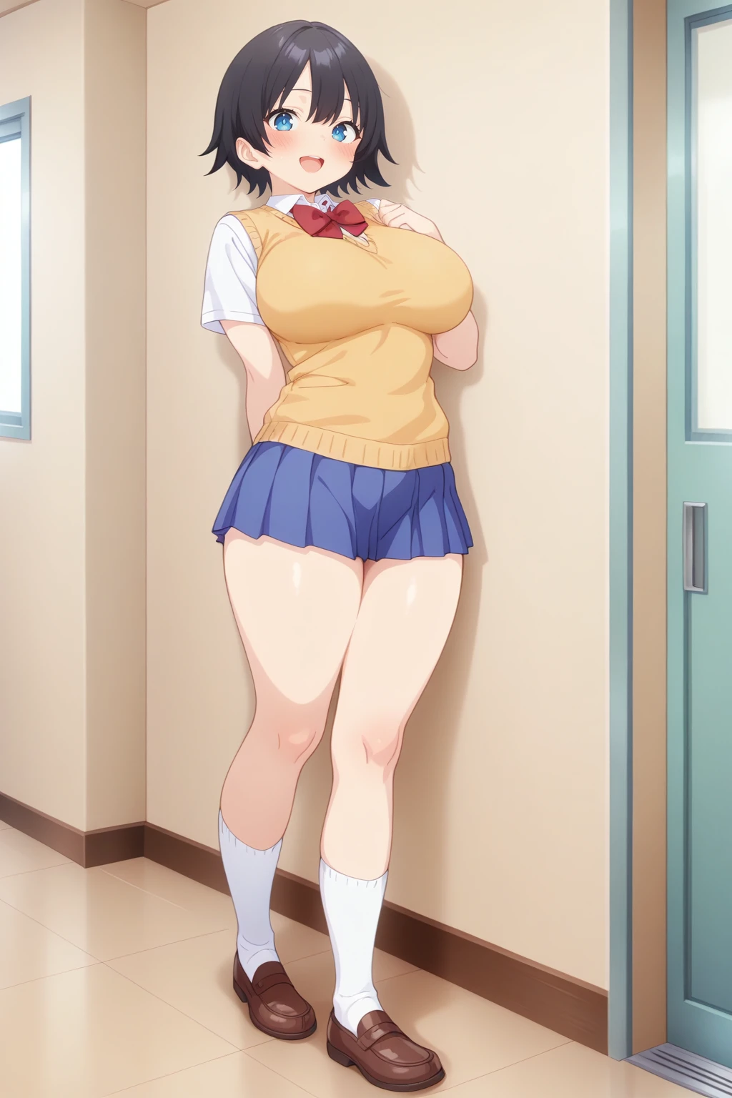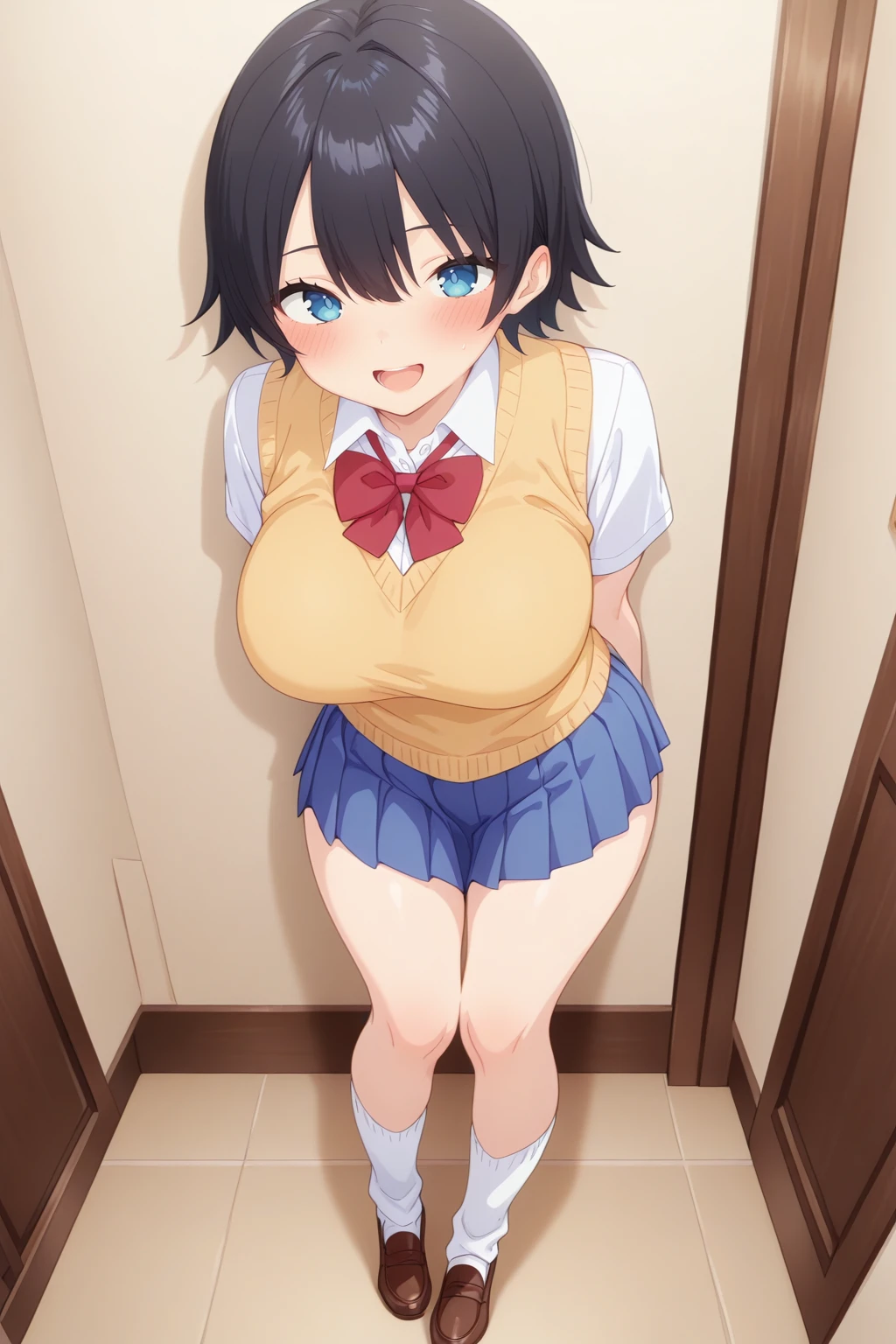 natsume_saya_realityform, 1girl, blue eyes, bow, red bow, black hair, short hair, school uniform, shirt, bowtie, white shirt, blush, sweater vest, blue skirt, black socks, brown shoes,