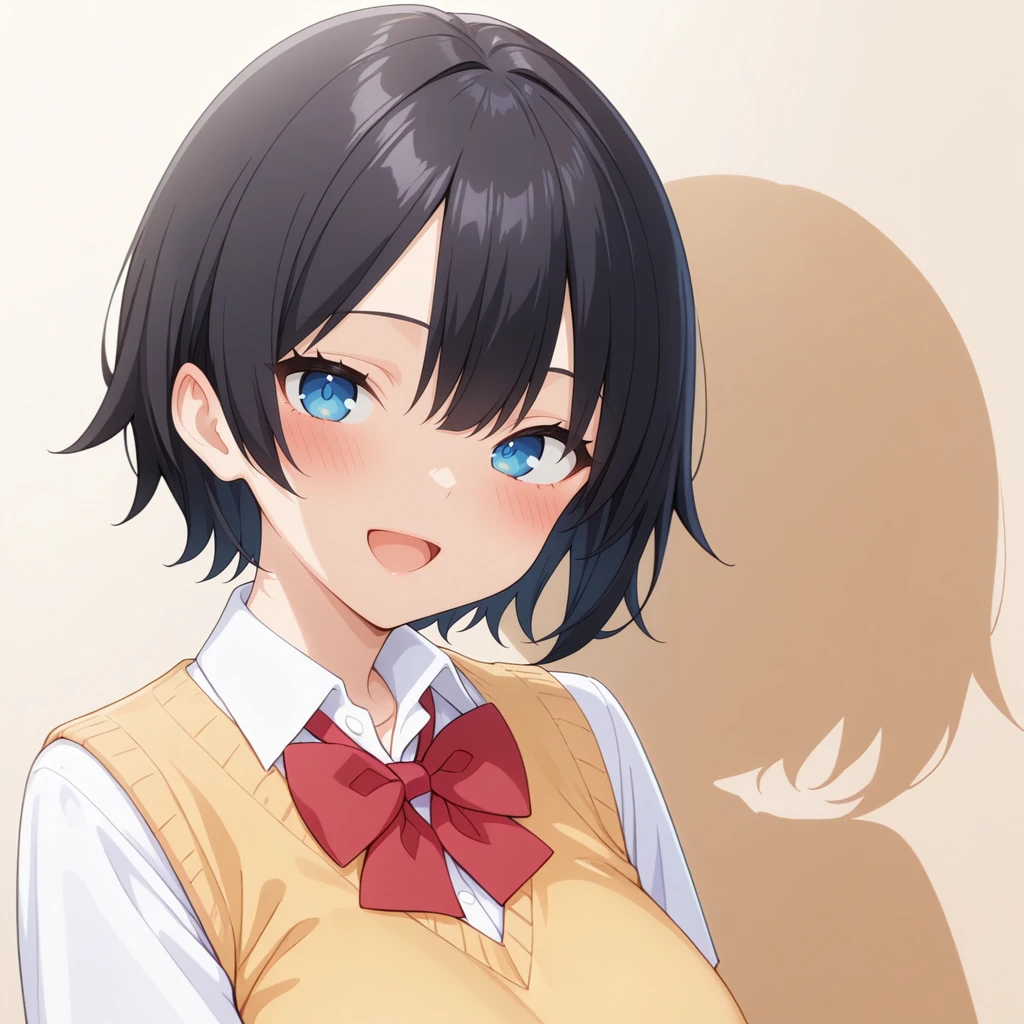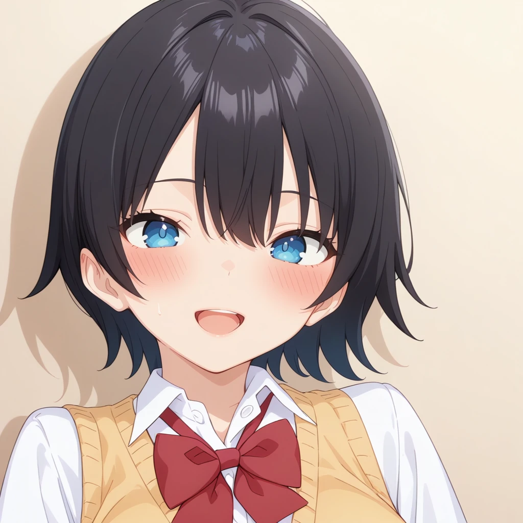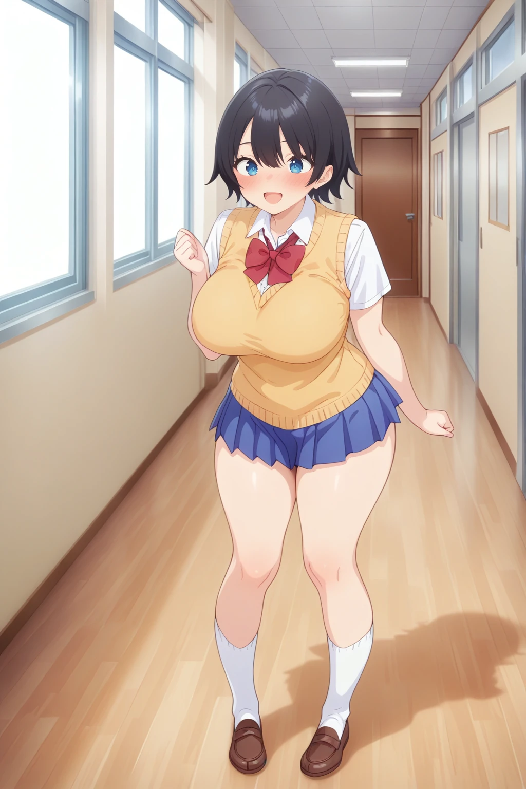natsume_saya_realityform, 1girl, blue eyes, bow, red bow, black hair, short hair, school uniform, shirt, bowtie, white shirt, blush, sweater vest, blue skirt, black socks, brown shoes,