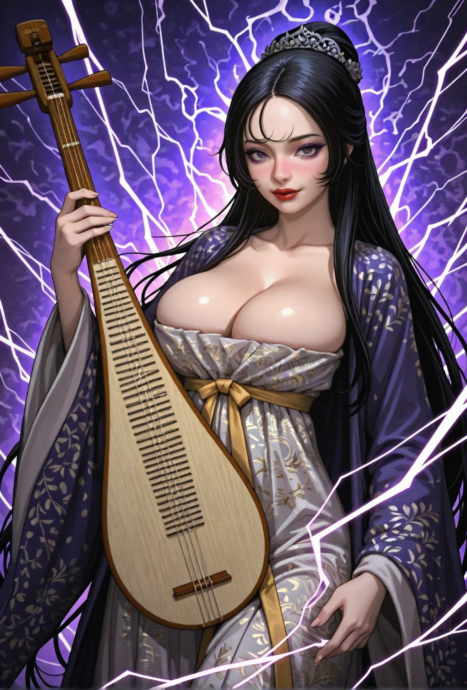hanfu style dress, purple floral kimono robe, golden corset sash, low neckline dress, ornamental patterns, pleated chest wrap, layered hanfu dress, white fabric, around arms, cleavage, holding pipa
