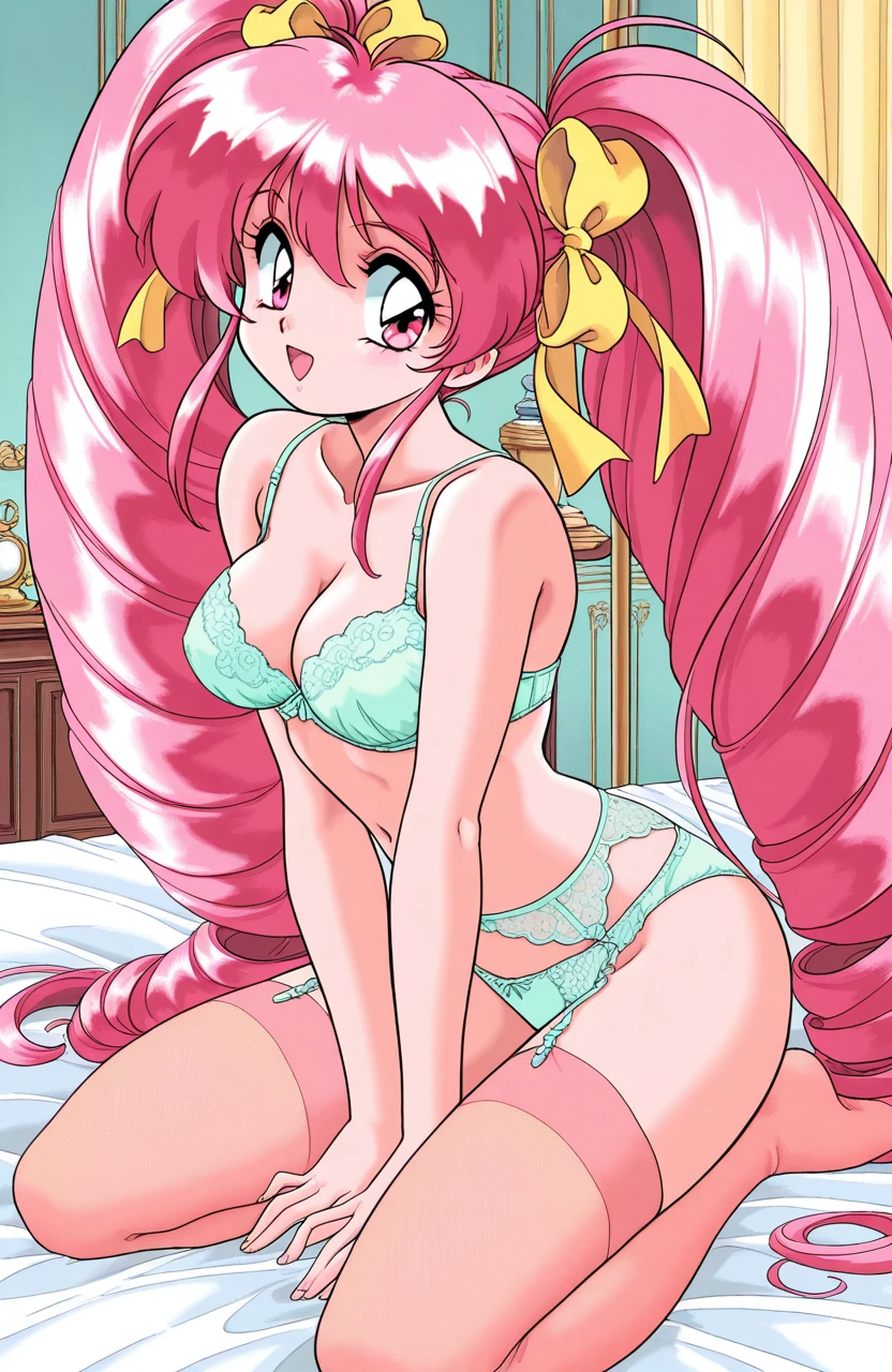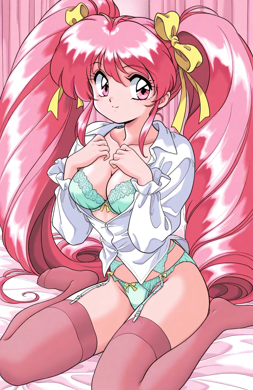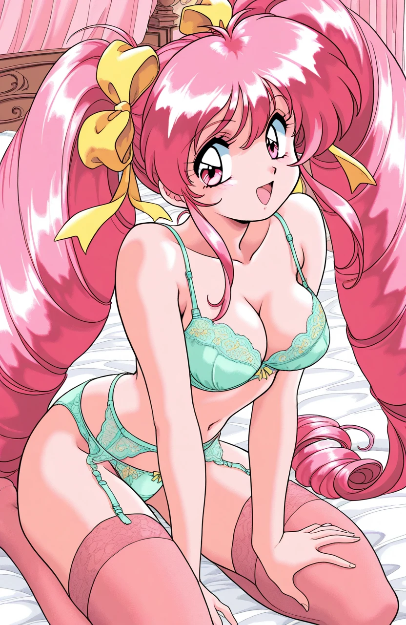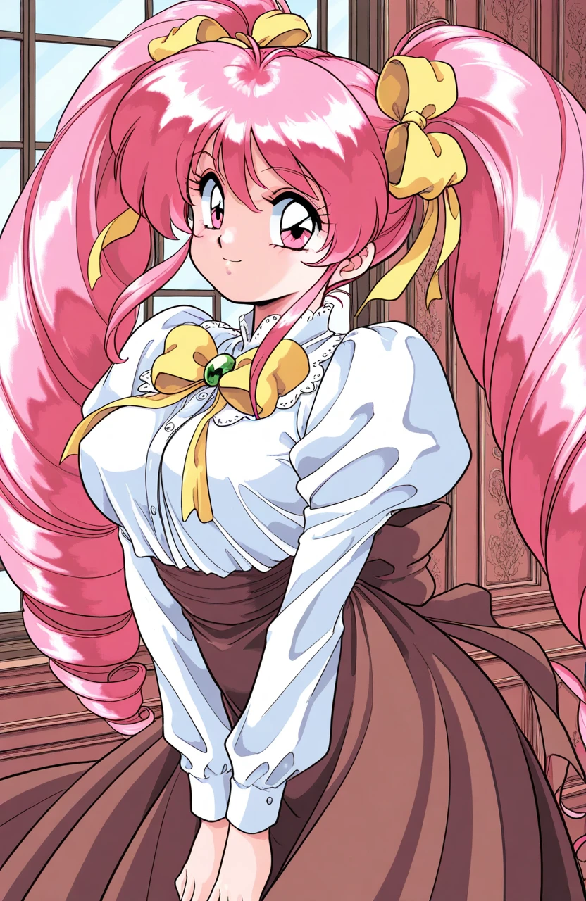 Nishino_Yoko,1girl,solo, pink eyes, pink hair, big hair, very long hair, twintails, drill hair, hair ribbon, yellow bow, large breasts, 1990s (style), retro artstyle,