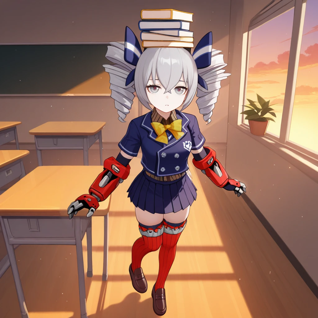 Bron, Fol001, Br_Def, bronya zaychik, grey hair, grey eyes, twin drills, striped bow, dark blue bow, hair bow, dark blue jacket, cropped jacket, collared shirt, striped shirt, brown shirt, short sleeves, dark blue sleeves, elbow gloves, black gloves, mechanical gauntlets, ribbed thighhighs, red thighhighs, mechanical legwear, pleated skirt, dark blue skirt,School Swimsuit: