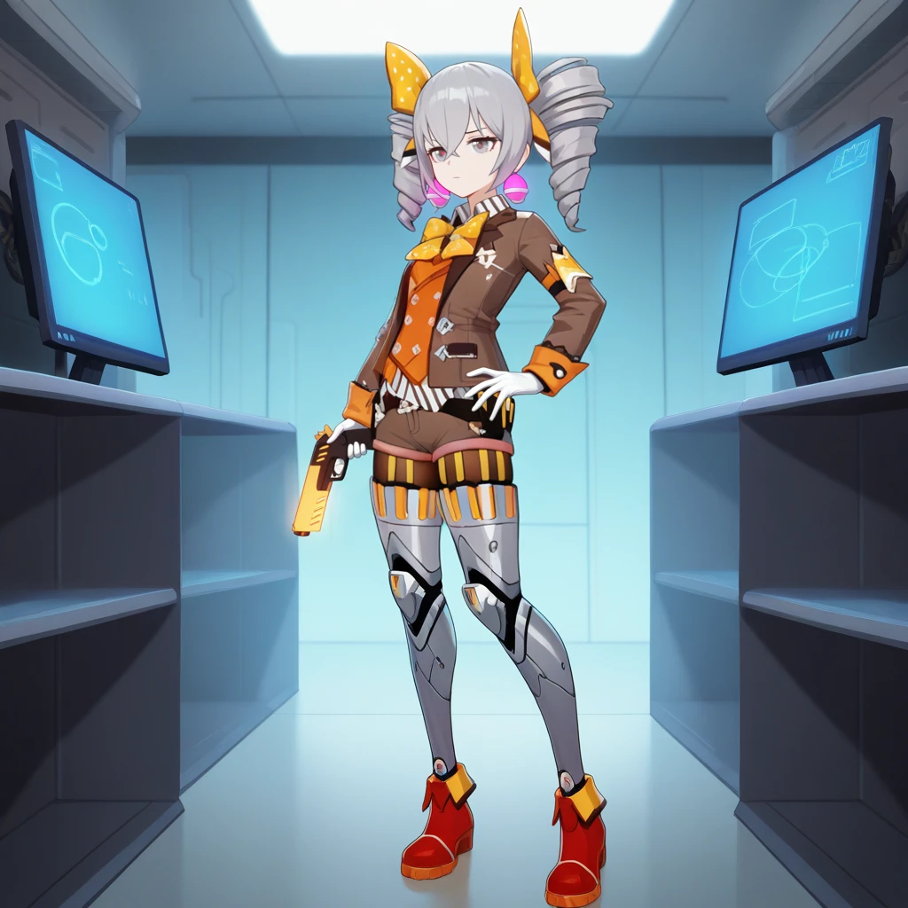 Bron_Def, brown jacket, long sleeves, polka dot bow, pink earrings, orange vest, belt, jewelry, orange bowtie, polo shirt, brown shorts, white gloves,Optional: For mechanical legs add: "mechanical legs, silver legwear, joints" into the Prompt.