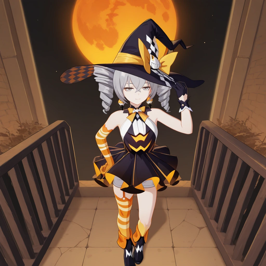 Bron, Fol002, Br_Hal, bronya zaychik, grey hair, grey eyes, halloween costume, witch hat, halter dress, black dress, white halter top, yellow ribbon, neck ribbon, bare shoulders, striped gloves, orange gloves, mismatched gloves, single elbow glove, alt single wrist cuff, black glove, alt shorts under dress, white shorts, short shorts, striped thighhighs, single thighhigh, single garter strap, orange thighhighs, cross earrings, twin drills, frilled skirt,Yamabuki Armor: