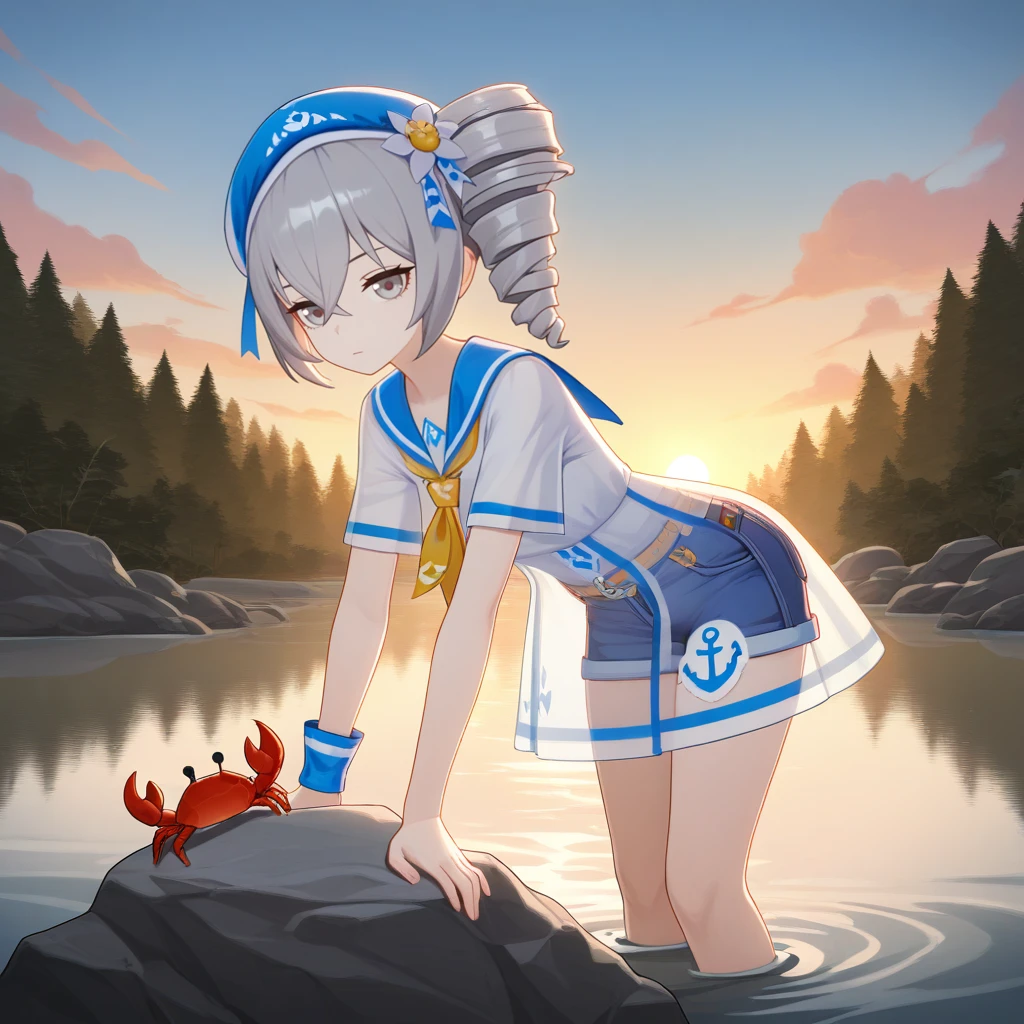 Bron, Fol001, Br_Sai, bronya zaychik, grey hair, grey eyes, shorts under dress, see-through, blue shorts, denim shorts, brown belt, see-through dress, sundress, sailor dress, white dress, light blue sailor collar, yellow necktie, white armband, beret, blue headwear, single wrist cuff, side drill, anchor,Snowy Sniper: