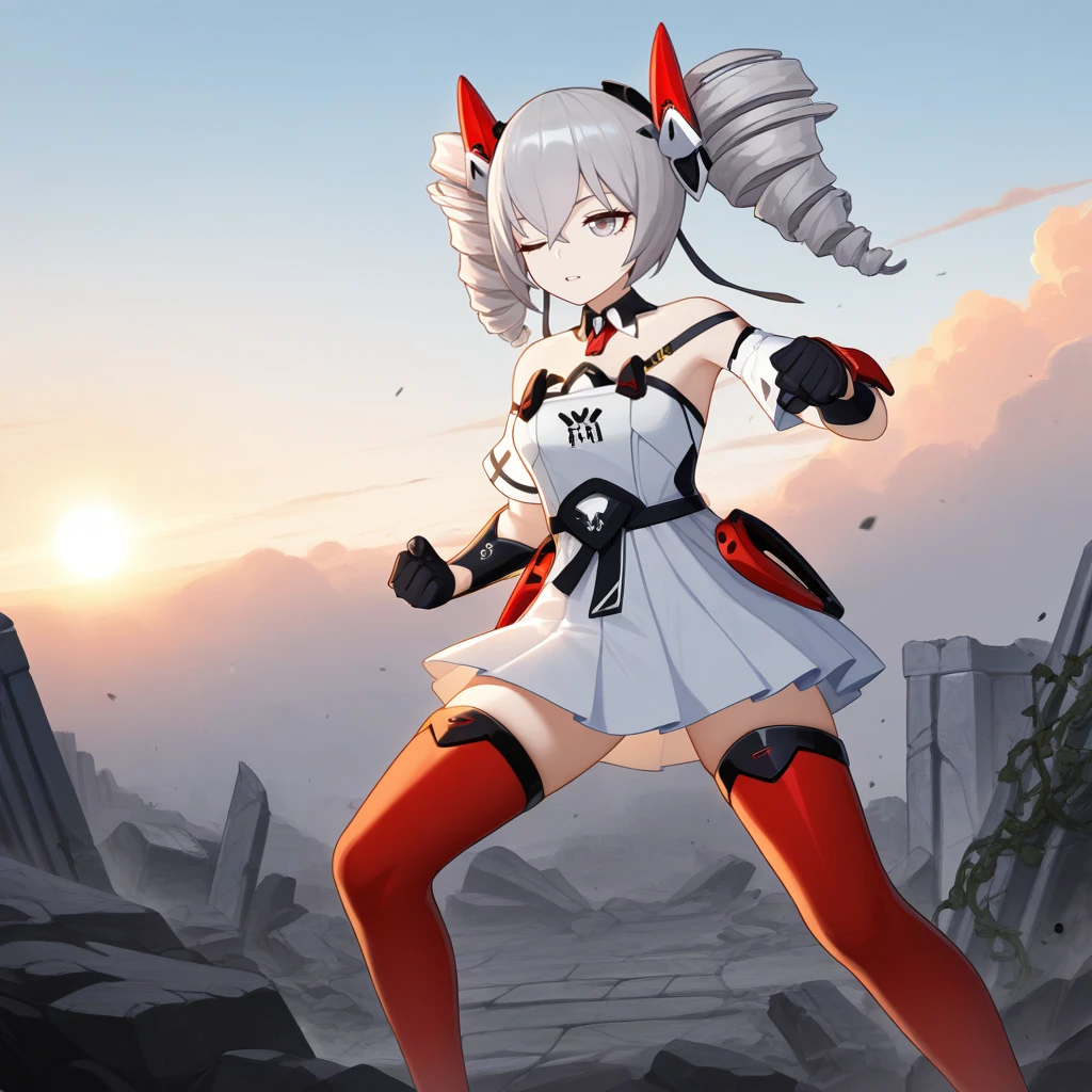 Bron, Fol002, Br_Drk, bronya zaychik, grey hair, grey eyes, alt white dress, twin drills, pleated dress, detached collar, black trim, black ribbon, ribbon, chest strap, detached sleeves, alternate short sleeves, alt white sleeves, wrist guards, alt gloves, alternate black gloves, thighhighs, red thighhighs, headgear,Wolf's Dawn: