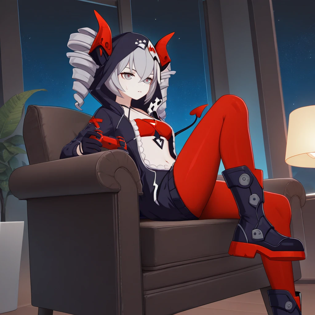 Bron, Fol002, Br_Cnd, bronya zaychik, grey hair, grey eyes, open hoodie, unzipped hoodie, zipper, partially unzipped, black hoodie, red pantyhose, alt pantyhose, gloves, alt black gloves, navel, demon horns, demon tail, demon girl, red bra, criss-cross halter,Drive Kometa: