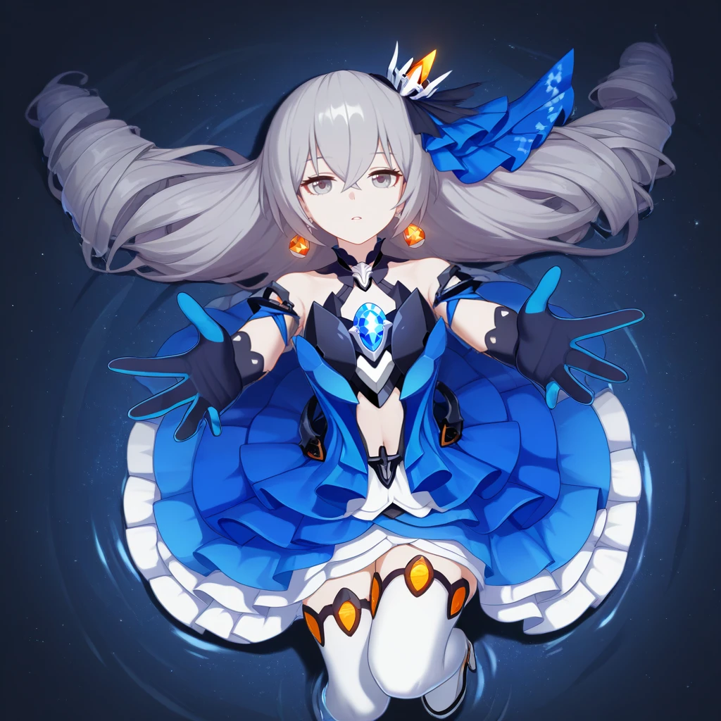 Bron, Fol004, Br_Hor, bronya zaychik, grey hair, grey eyes, long hair, drill hair, orange earrings, mini crown, blue veil, veil, layered dress, white skrit, alternate frilled skirt, layered skirt, blue dress, blue gemstone, alt thighhighs, white thighhighs, chest gem, haltereneck, black collar, black chestplate, center cutout, navel, long gloves, blue gloves, two-tone gloves, different black gloves,Magic Girl Bronya: