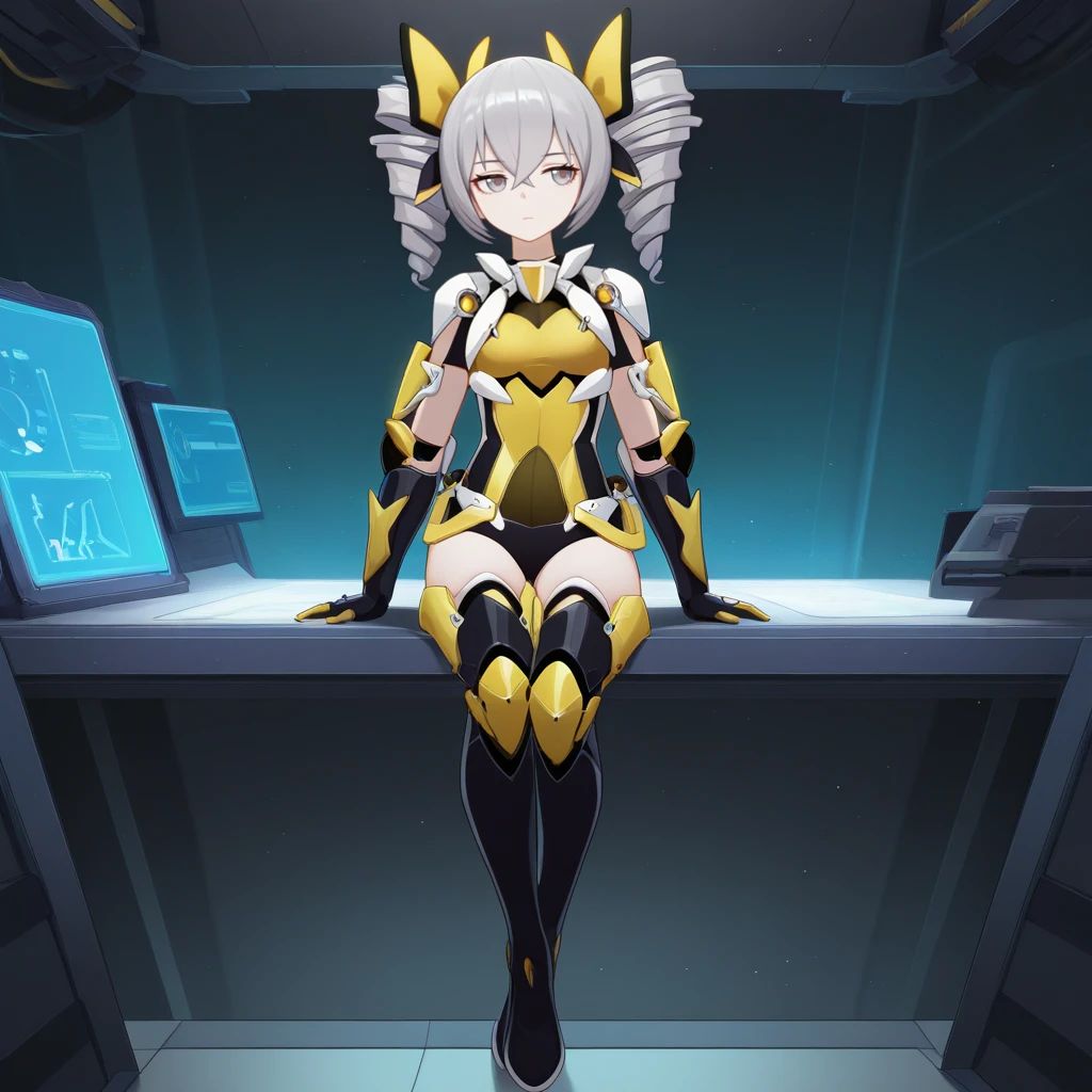 Bron, Fol002, Br_Yam, bronya zaychik, grey hair, grey eyes, armored leotard, armor, yellow leotard, clothing cutout, arm armor, thigh boots, black footwear, two-tone bow, alternate hair bow, twin drills,Candy Demon: