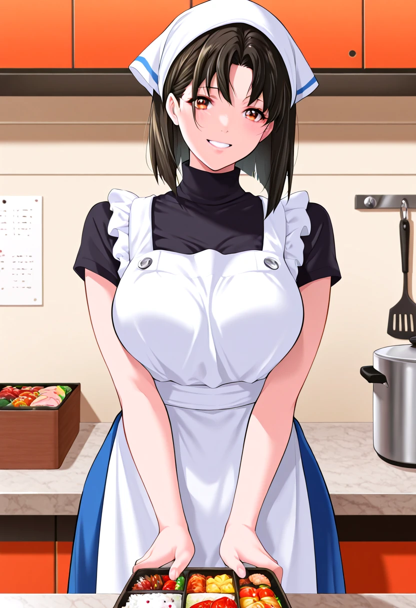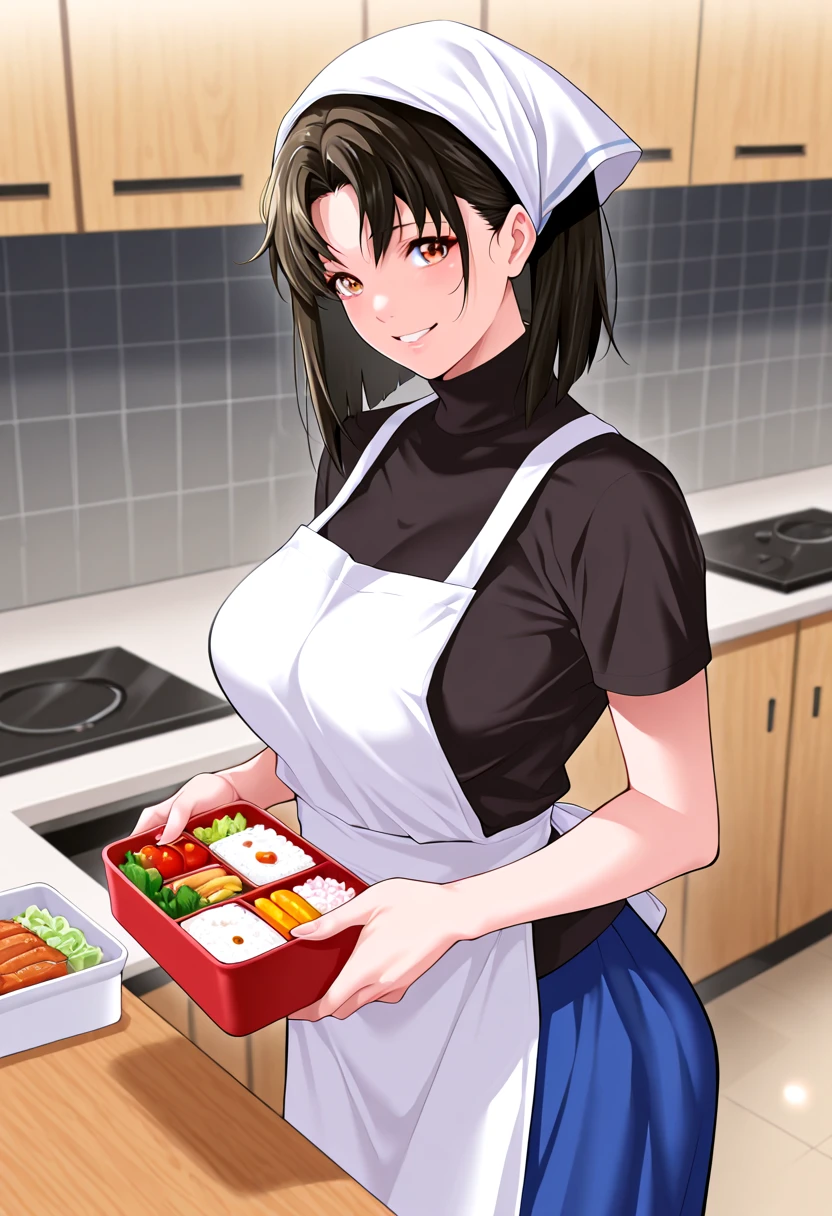 お弁当屋さん勤務服 : Black turtleneck Short sleeve shirt, blue long skirt, white apron, Headscarf, flats shoes
