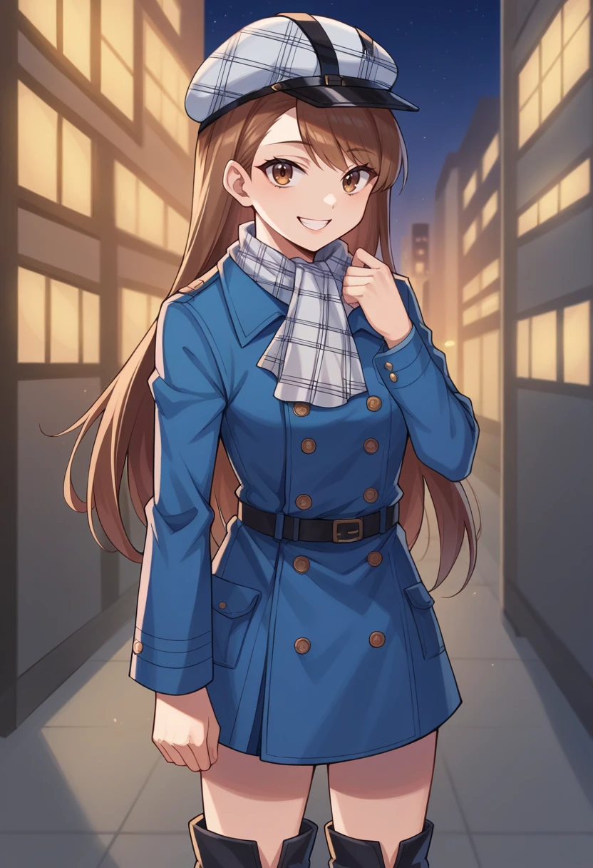 kumikods, brown hair, long hair, cabbie hat, plaid scarf, blue coat, knee boots